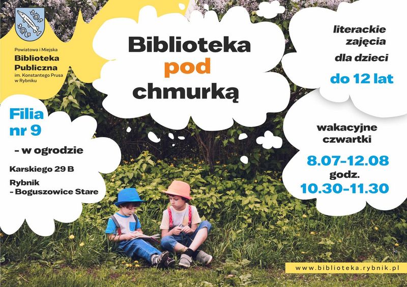 „Biblioteka pod chmurką” to wakacyjna propozycja zajęć dla dzieci do 12 lat, które odbędą się w wakacyjne czwartki między 8 lipca a 12 sierpnia w bibliotecznym ogródku Filii nr 9 PiMBP przy ul. Karskiego 29 B w godz. 10:30 – 11:30.
