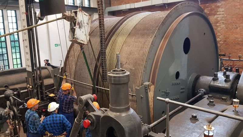 W sobotę i niedzielę w Zabytkowej Kopalni Ignacy przeprowadzono niezwykle skomplikowaną operację zawieszenia liny wyciągowej. Pierwszym etapem prac było ponowne uruchomienie maszyny parowej i nawinięcie stalowej liny na bęben. Stulatka poradziła sobie z zadaniem i odzyskała swój ważny atrybut: złotą cynkowaną stalową linę o przekroju 46 mm, 650 m długości i wadze ok. 5000 kg.