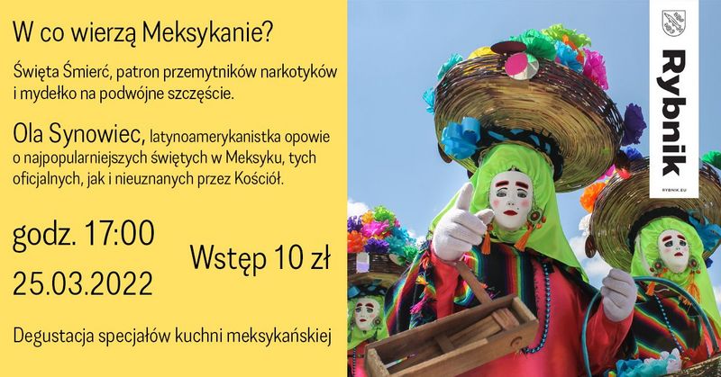 Ola Synowiec, latynoamerykanistka od lat zajmująca się meksykańską religijnością, opowie o najpopularniejszych świętych w Meksyku, zarówno tych oficjalnych, jak i nieuznanych przez Watykan – takich jak Święta Śmierć, święty przemytników narkotyków i święci od przekraczania granicy z USA. Zapraszamy na spotkanie z niezwykłą, kolorową, a czasem szokującą meksykańską religijnością, którą postaramy się oswoić, wyjaśnić i zrozumieć.