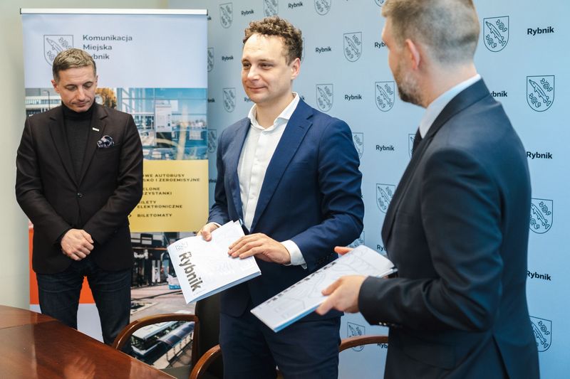 Poniżej zdjęcia z konferencji prasowej, na ktorych są: Piotr Kuczera – Prezydent Miasta Rybnika, Łukasz Kosobucki – Prezes spółki Komunikacja Miejska Rybnik Sp. z o.o. i Rafał Zajas, Dyrektor Sprzedaży Regionu Południowego Solaris Bus & Coach Sp. z o. o.: