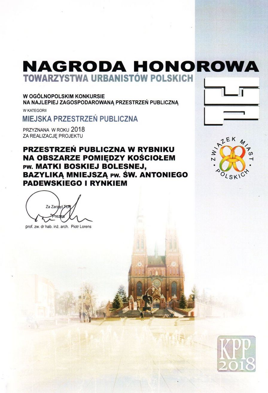 Organizujący konkurs urbaniści dostrzegli wyjątkowość zagospodarowania w przestrzeni publicznej na obszarze pomiędzy kościołem pw. Matki Boskiej Bolesnej, Bazyliką Mniejszą pw. św. Antoniego Padewskiego i Rynkiem, nagradzając Urząd Miasta Rybnika oraz autorów:
