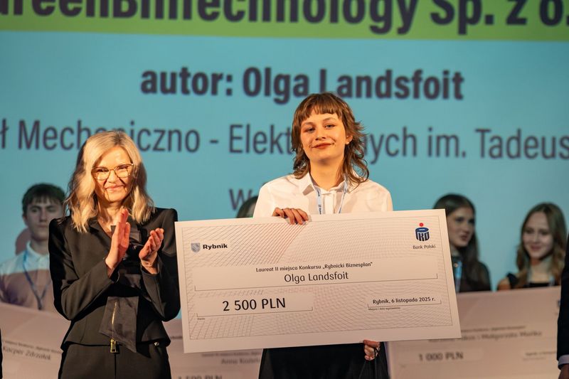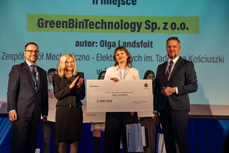 - II miejsce: Olga Landsfoit z Zespołu Szkół Mechaniczno-Elektrycznych za projekt „GreenBinTechnology Sp. z o. o.” – firmę produkującą inteligentne pojemniki do automatycznej segregacji odpadów w gospodarstwach domowych.