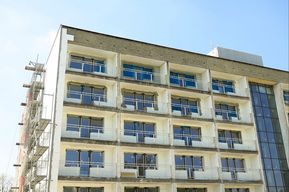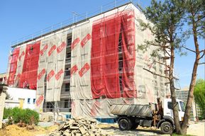 Prace realizowano też na zewnątrz budynku. Zachodnia ściana szczytowa oraz ściany balkonowe i niskiego budynku zostały docieplone. Część balustrad balkonowych została wymieniona, ponad dach wyprowadzono kominy. Wykonano ponadto roboty instalacyjno-sanitarne (m.in. wymiana instalacji kanalizacji, wentylacji mechanicznej, grzewczej, okablowanie instalacji elektrycznych, montowana jest rozdzielnia główna).