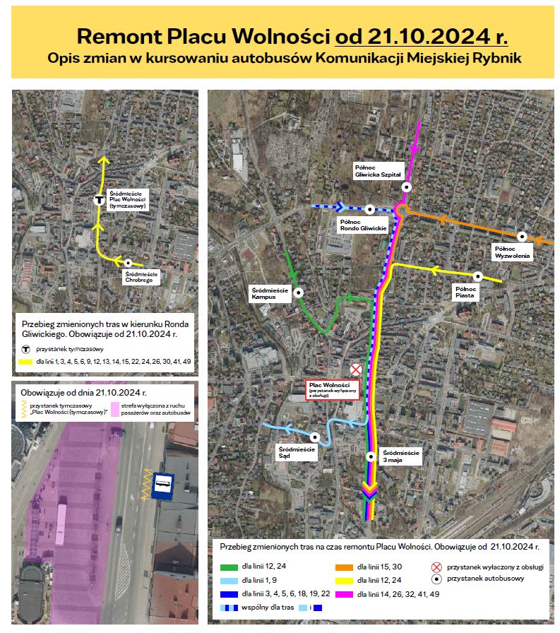 Na potrzeby objazdu zostanie utworzony tymczasowy przystanek Śródmieście Plac Wolności (tymczasowy), usytuowany wzdłuż ulicy w kierunku Ronda Gliwickiego, bez wjazdu na Plac Wolności. Szczegółowa lokalizacja została wskazana na mapie (poniżej).