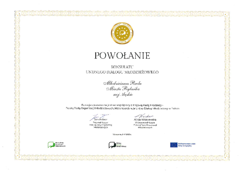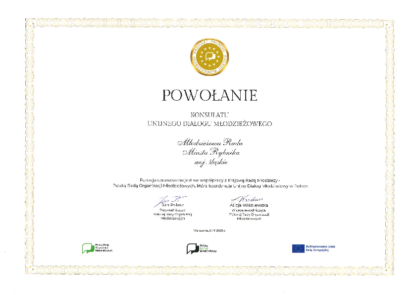 Młodzieżowa Rada Miasta Rybnika otrzymała prestiżowy tytuł Konsulatu Unijnego Dialogu Młodzieżowego (EU Youth Dialogue). To wyróżnienie trafia do rad i sejmików, które wykazują się największą aktywnością w swoich lokalnych środowiskach.