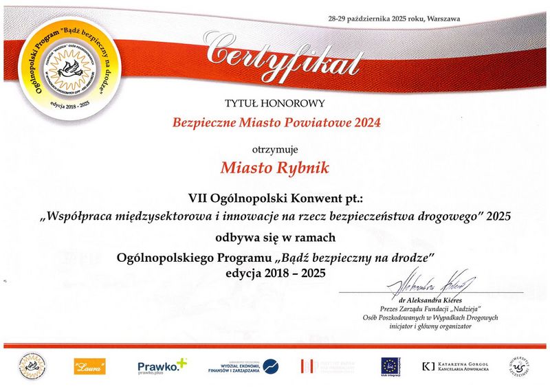 Miasto Rybnik zostało laureatem w kategorii najbezpieczniejsze miasto na prawach powiatu, w którym odnotowano najniższą liczbę ofiar śmiertelnych, osób rannych oraz wypadków.