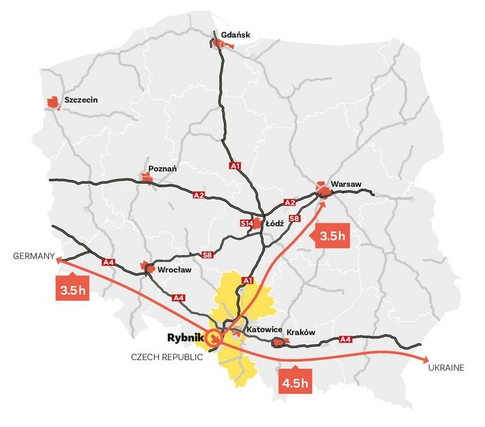 Rybnik has direct, regular rail connections to Rybnik with the most important cities in Poland (including Warsaw, Kraków, Wrocław, Gdańsk, Katowice, Bielsko-Biała), as well as with the capitals of several European countries (Vienna, Bratislava, Budapest, Prague). The proximity of the A1 and A4 highways (in the vicinity of one of the biggest highway junctions in Europe), a well-developed road system, efficient public transport, extensive possibilities for spending time actively – these are the advantages of Rybnik, which all make it attractive and a place conducive to the growth of business.
